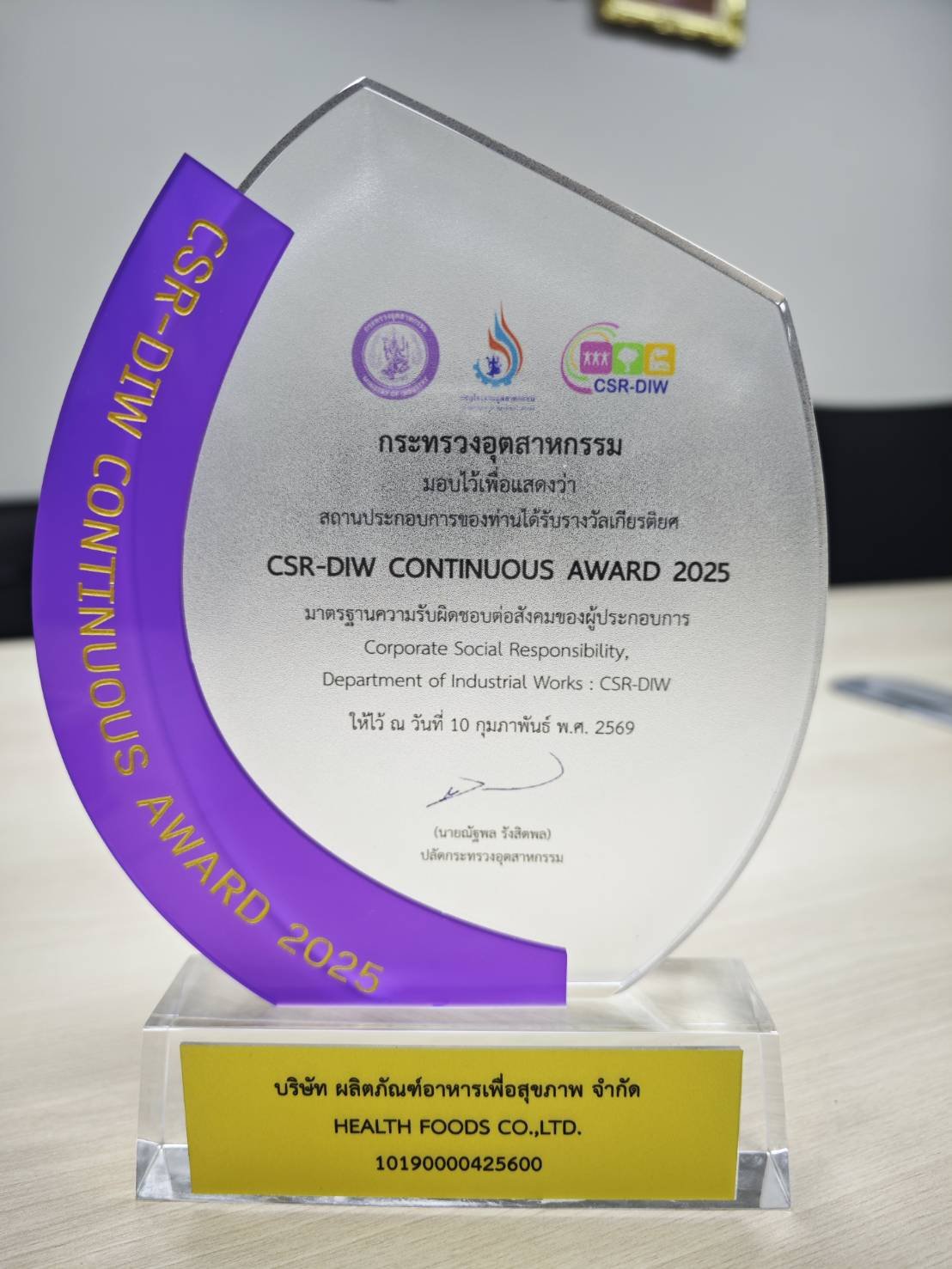 ความสำเร็จที่ต่อเนื่อง คือความยั่งยืนที่แท้จริง บริษัท ผลิตภัณฑ์อาหารเพื่อสุขภาพ จำกัด ในเครือเฮ็ลธ์ฟู้ดส์ฯ ภาคภูมิใจได้รับรางวัล CSR-DIW Award 2025 ภายใต้โครงการส่งเสริมโรงงานอุตสาหกรรม